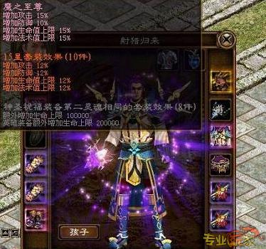 “魔之至尊”要求至少10件以上的装备为紫色装,即装备名字为紫色,周围泛起紫色星块那种。制作紫色装备的前提条件是所要制作的装备必须是1转145级别以上(包括145)的绿色完美15星,否则将不能制作。“魔之至尊”效果如上图。