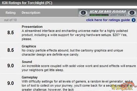 由Runic Games 制作的似暗黑风格角色扮演游戏《火炬之光》已上市,上市后受到玩家热捧。昨日IGN公布迟来的评分为8.6分,详细见下面列表。