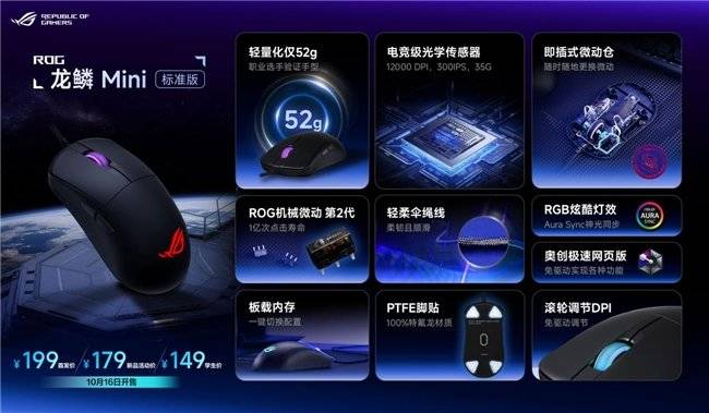ROG龙鳞MINI标准版鼠标专为抓握和指握玩家打造,手型与经典款鼠标龙鳞ACE MINI一致。其采用52g轻量化设计,握持更舒适。性能上,搭载电竞级光学传感器,具备12000 DPI、300IPS和35G加速度,确保在激烈的游戏对战中提供精准的定位与迅捷的响应。更贴心的是,ROG龙鳞Mini标准版鼠标采用板载内存,可一键切换配置,适应不同游戏场景。滚轮调节DPI功能则免驱动调节,便捷又高效。同时,还配备了PTFE脚贴,提供顺滑移动体验,让玩家轻松掌控全局。还采用轻柔伞绳线,柔韧且顺滑,有效减少拖拽感。值得关注的是,首发期间玩家还可享受直降20元的超值福利,到手价低至179元,学生价低至149元。